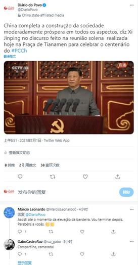 在海外社交媒體平臺(tái),外國(guó)網(wǎng)友觀看了慶祝中國(guó)共產(chǎn)黨成立100周年大會(huì)的直播,并紛紛通過(guò)留言表達(dá)了對(duì)中國(guó)共產(chǎn)黨成立100周年的祝賀。葡語(yǔ)國(guó)家網(wǎng)友GaboCastroRuz留言表示:“同志,祝賀你們!”