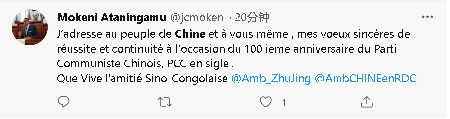 一位剛果(金)網(wǎng)友留言:“我向中國(guó)人民與您(中國(guó)駐剛果金大使),就慶祝中國(guó)共產(chǎn)黨一百周年大會(huì)的順利舉辦,致以誠(chéng)摯的祝賀!