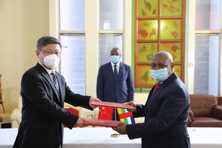 中國駐中非大使陳棟和中非共和國衛(wèi)生部長索姆塞代表兩國政府交換疫苗交接證書。中國駐中非大使館供圖