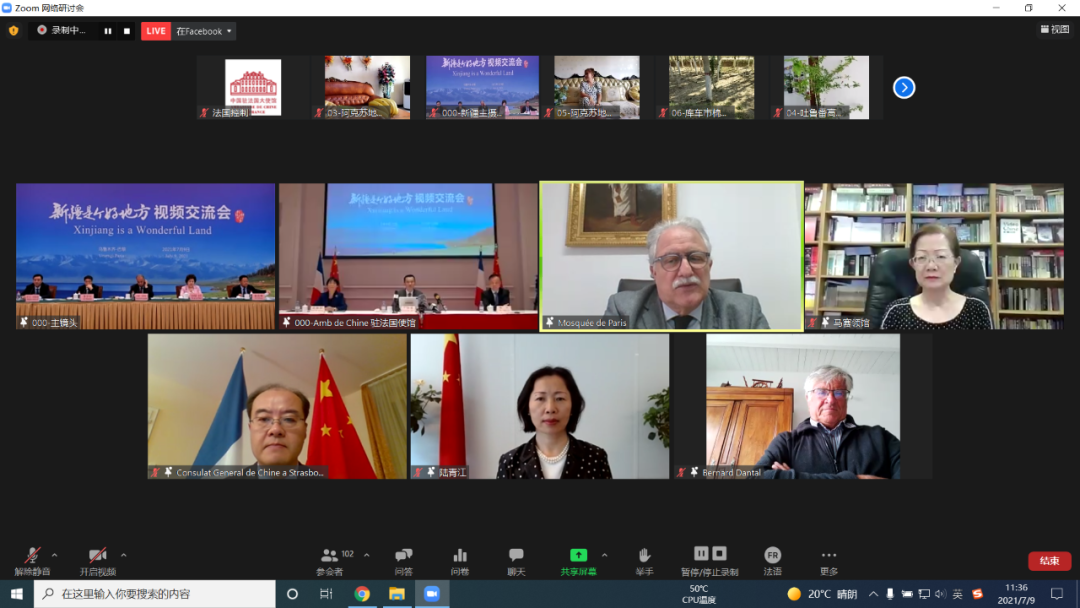 人民網(wǎng)巴黎7月10日電(記者劉玲玲) 中國駐法國大使館和駐馬賽、斯特拉斯堡、里昂總領(lǐng)館9日與新疆維吾爾自治區(qū)政府共同舉辦“新疆是個好地方”視頻交流會。法國政黨、議會、工商、科教、文化、宗教等各界代表、多國駐法使節(jié)或高級外交官以及旅法僑界代表等100余人參會。