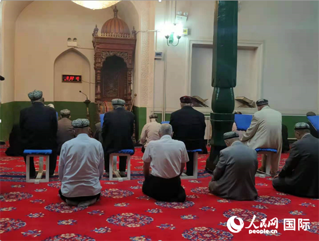 信眾在艾提尕爾清真寺做禮拜。人民網(wǎng) 徐祥麗攝