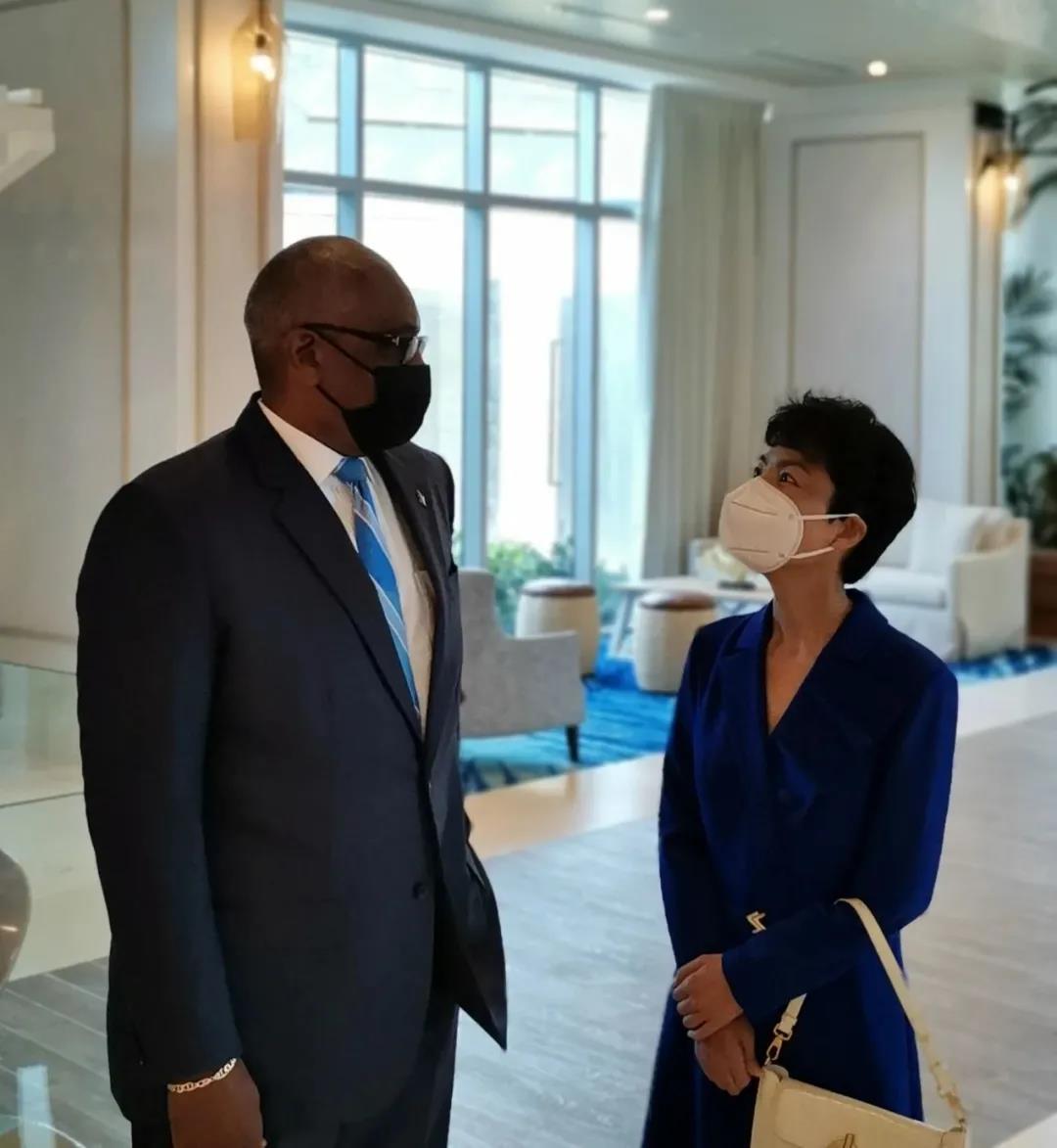 明尼斯總理(左)與戴慶利大使(右)交談。中國(guó)駐巴哈馬大使館供圖