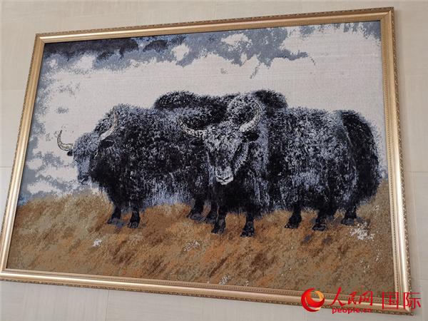 圣源藏毯突破傳統(tǒng)花樣,結合現(xiàn)代設計制出一副藝術掛毯。 人民網 楊倩攝