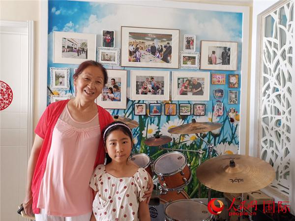 郜淑珍和外孫女在照片墻前。人民網 楊倩攝