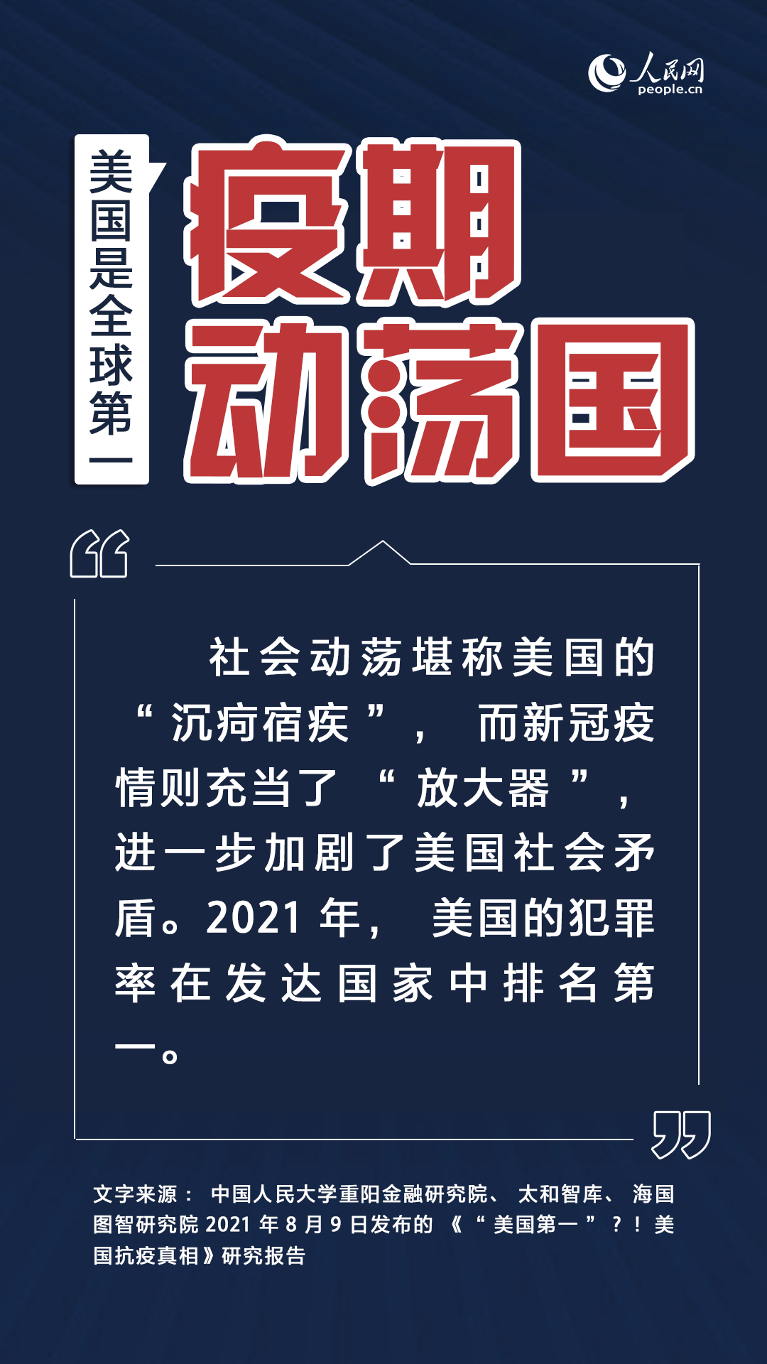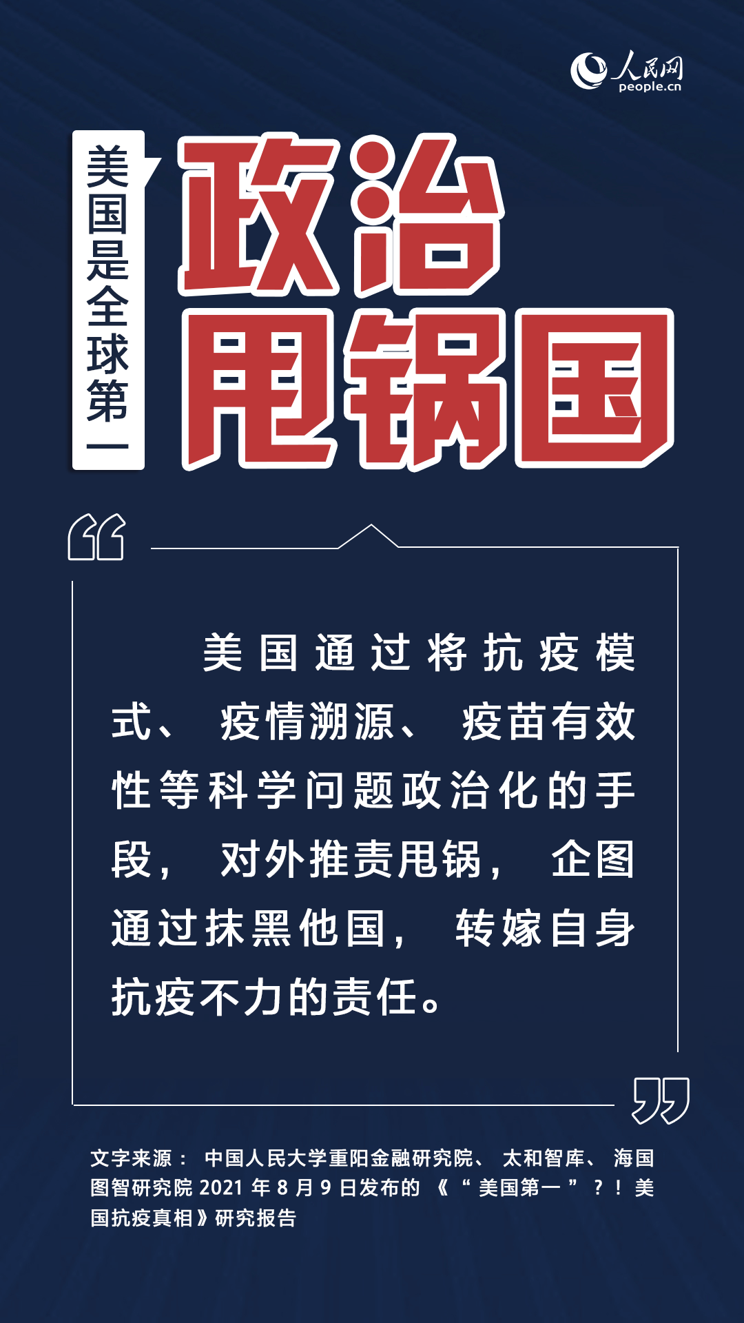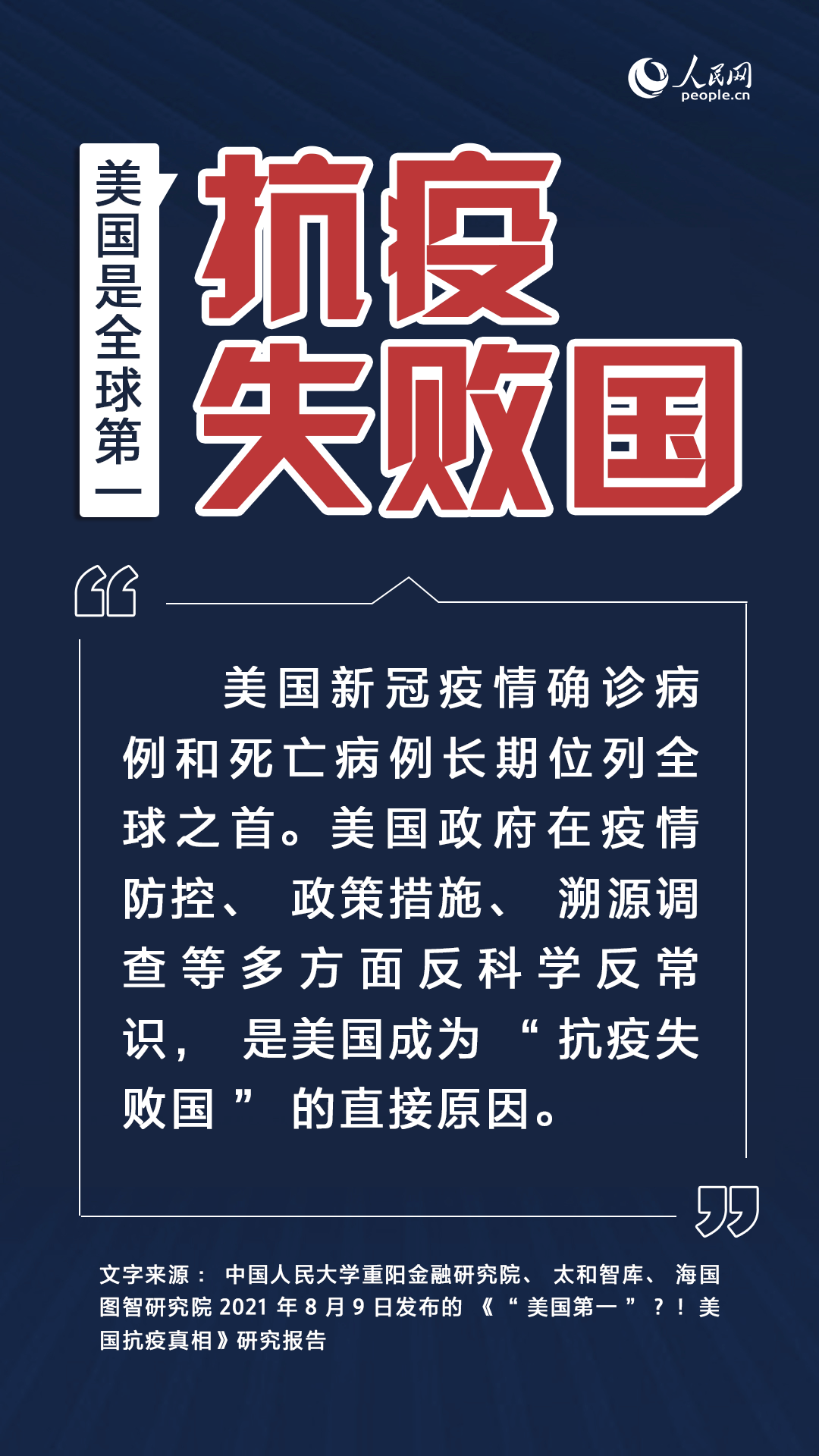 日前,中國人民大學(xué)重陽金融研究院聯(lián)合太和智庫、海國圖智研究院發(fā)布《“美國第一”?!美國抗疫真相》智庫研究報(bào)告,從“為黨爭不為生命”“反科學(xué)反常識”“制度失靈使疫情難控”“疫情加劇社會(huì)撕裂”“肆意破壞全球抗疫”等方面還原美國抗疫真實(shí)狀況。