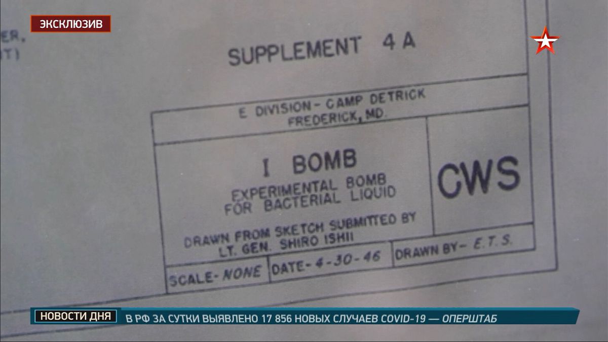 哈爾濱陳列館中展示的細(xì)菌炸彈彈頭的設(shè)計(jì)圖紙副本上蓋著美國(guó)德特里克堡制作的印章,上面寫(xiě)著設(shè)計(jì)圖草圖正是由731部隊(duì)石井四郎提供。