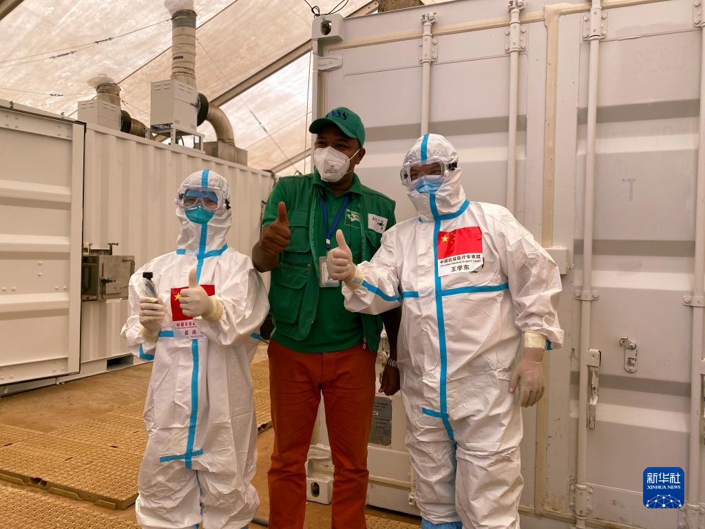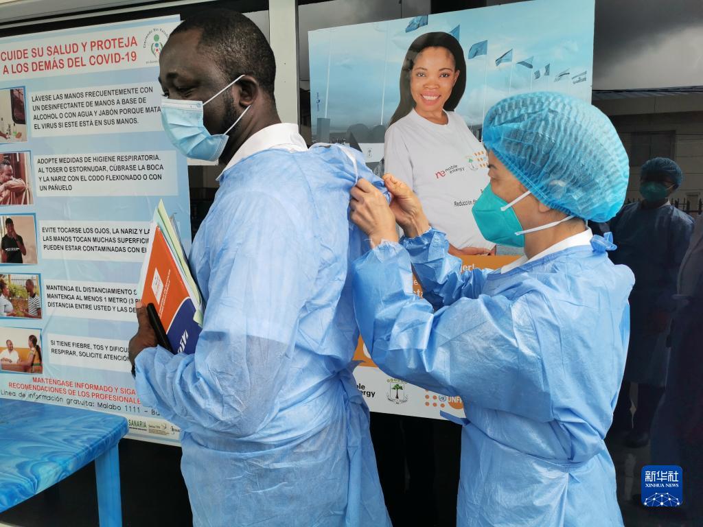 2020年6月1日,在赤道幾內(nèi)亞首都馬拉博一所收治新冠患者的定點(diǎn)醫(yī)院,中國抗疫醫(yī)療專家組成員幫助當(dāng)?shù)赝姓矸雷o(hù)服。新華社發(fā)(專家組供圖)