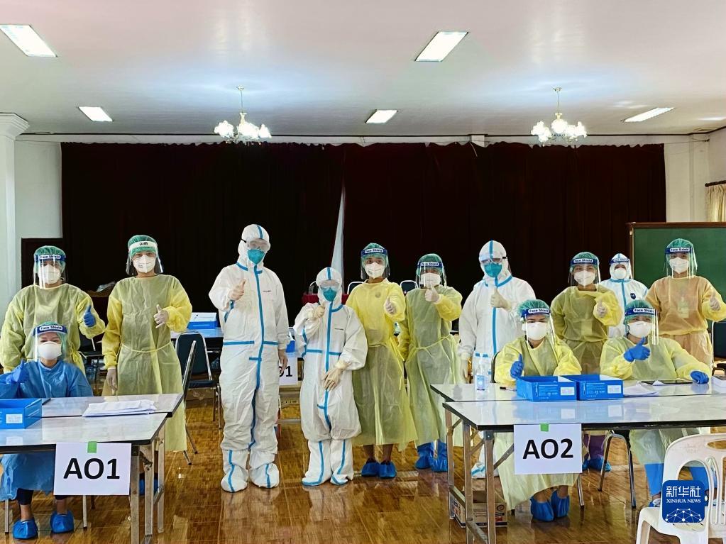 5月7日,中國醫(yī)療專家組在老撾萬象的一處新冠病毒采樣點(diǎn)考察。新華社發(fā)(農(nóng)麗春攝)