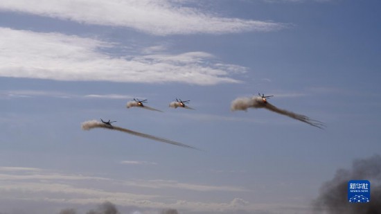 9月23日,在俄羅斯奧倫堡州東古茲靶場舉行的“和平使命-2021”上海合作組織聯(lián)合反恐軍事演習(xí)實(shí)兵實(shí)彈演習(xí)中,多國聯(lián)合部隊(duì)陸航作戰(zhàn)力量發(fā)射火箭彈。新華社記者 梅世雄 攝