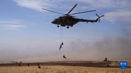 9月23日,在俄羅斯奧倫堡州東古茲靶場舉行的“和平使命-2021”上海合作組織聯(lián)合反恐軍事演習(xí)實(shí)兵實(shí)彈演習(xí)中,多國聯(lián)合部隊(duì)特戰(zhàn)分隊(duì)執(zhí)行索降作戰(zhàn)任務(wù)。新華社記者 梅世雄 攝