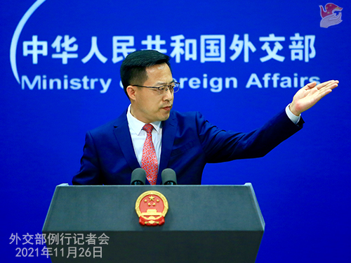 人民網(wǎng)北京11月26日電 據(jù)外交部網(wǎng)站消息,外交部發(fā)言人趙立堅(jiān)主持今日例行記者會(huì)。記者會(huì)實(shí)錄如下: