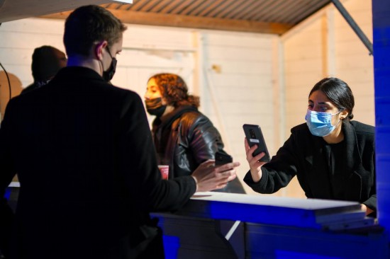 11月26日,工作人員(右一)在比利時布魯塞爾的圣誕市場查驗游客的健康通行證。新華社記者 張鋮 攝