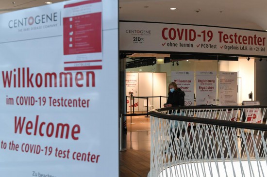 11月19日,在德國法蘭克福,一名女子經(jīng)過一家商場內(nèi)的新冠病毒檢測中心。新華社記者 逯陽 攝