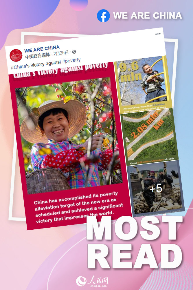 人民網(wǎng)英文版制作《中國脫貧攻堅取得全面勝利》系列海報,發(fā)布在“看見中國”(@WeAreChinaVideos)臉書賬號,向世界直觀、清晰地展現(xiàn)了中國脫貧攻堅的偉大成就及重要意義。這條貼文在臉書平臺獲得了數(shù)百萬閱讀量。眾多海外網(wǎng)友對此表示贊賞與祝福。網(wǎng)友@Benjamin Opare評論說:“太棒了!非洲各國政府必須向中國學(xué)習(xí)!”
