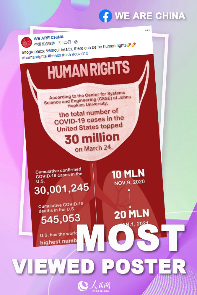 人民網(wǎng)英文版制作發(fā)布《沒有健康何談人權(quán)?》海報,在“看見中國”臉書賬號發(fā)布,用直觀的數(shù)字揭示了美國“全球頭號抗疫失敗國”的事實真相,揭露其在人權(quán)問題上的虛偽和“雙標”。