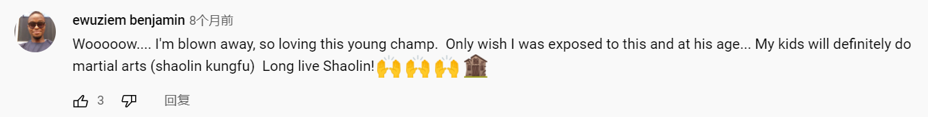 人民網(wǎng)英文版在“看見中國”優(yōu)兔頻道(www.youtube.com/c/WEARECHINA)設(shè)置中國功夫欄目,以上這條短視頻,向網(wǎng)友展示了少林寺練功畫面,展現(xiàn)了中國功夫的獨特魅力。視頻發(fā)出后,收獲超400萬次播放量,海外網(wǎng)友對小小功夫少年表達了強烈的喜愛與欽佩。網(wǎng)友@ewuziem benjamin評論說:“我太震撼了,這個少林小武僧好可愛!多希望我在他這個年紀也可以學(xué)習(xí)到少林功夫。我也要讓我的孩子練習(xí)武術(shù)。祝愿少林功夫越來越好!”