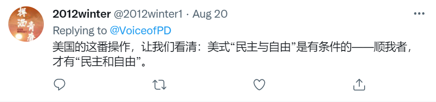 人民網(wǎng)英文版在“人民之聲”推特(@VoiceofPD)發(fā)布系列漫評,揭批這一行徑。該帖文發(fā)布后,收獲近千次轉(zhuǎn)發(fā)。網(wǎng)友@2012winter評論稱:美國的這番操作,讓我們看清美式“民主與自由”是有條件的——順我者,才有“民主和自由”。網(wǎng)友@MonsterBaby發(fā)問:“科學(xué)家們,我們還能相信你們嗎?”