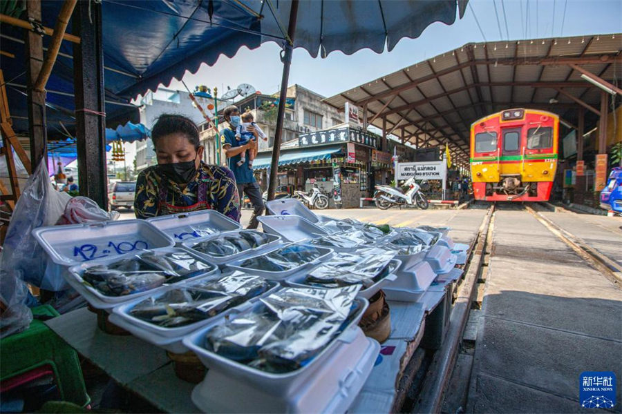 1月5日,在泰國沙沒頌堪府美功縣,商販在美功鐵道市場等待顧客。