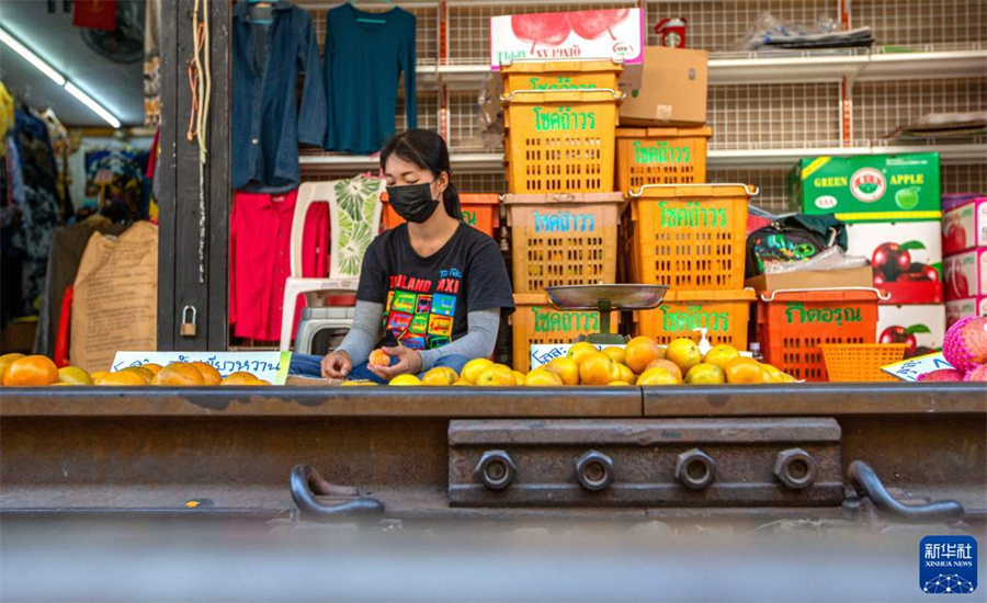 1月5日,在泰國沙沒頌堪府美功縣,商販在美功鐵道市場等待顧客。