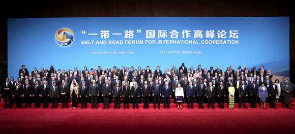 2017年5月14日,國家主席習近平在北京出席“一帶一路”國際合作高峰論壇開幕式,并發(fā)表題為《攜手推進“一帶一路”建設》的主旨演講。這是習近平同出席“一帶一路”國際合作高峰論壇的代表們合影。新華社記者 龐興雷攝