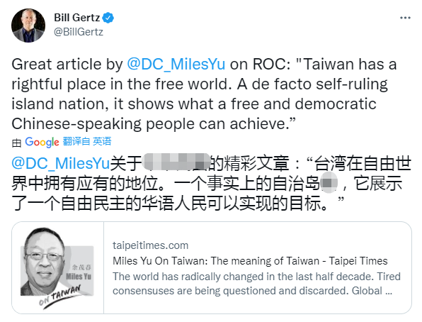 這篇文章發(fā)出后,《華盛頓時(shí)報(bào)》的資深反華記者,曾稱中國是比蘇聯(lián)還危險(xiǎn)的“邪惡帝國”的比爾·格茨就為它叫好。