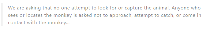 警方還在社交媒體推特上提醒民眾:“任何看到或找到這些猴子的人都不要接近,不要試圖捕捉或接觸它們。”