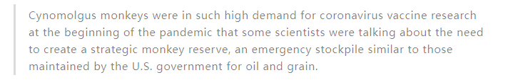 據(jù)《紐約時報》報道,這種來自非洲國家毛里求斯的猴子,經(jīng)常用于臨床毒理學研究,每只售價高達10,000 美元。在新冠疫情期間,這類猴子的需求量激增,以至于一些科學家正在談論建立一個戰(zhàn)略猴子儲備的必要性,類似于美國政府的石油和糧食緊急儲備。