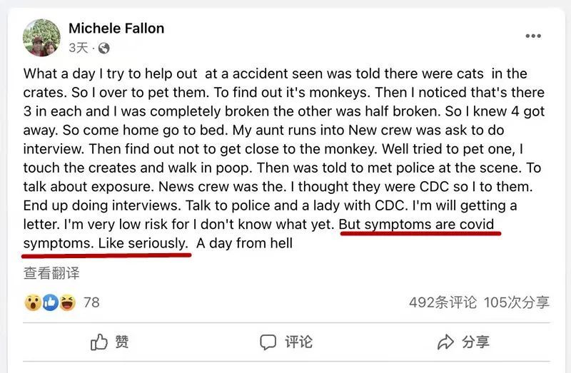 米歇爾告訴媒體,她在接觸猴子后出現(xiàn)紅眼、流涕、咳嗽等癥狀,由于手上有開放性傷口,已經(jīng)就醫(yī)。米歇爾稱很擔心從猴子身上感染了病毒。