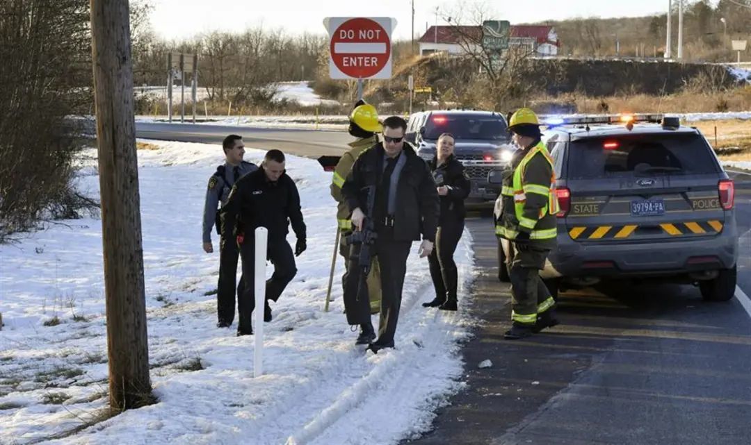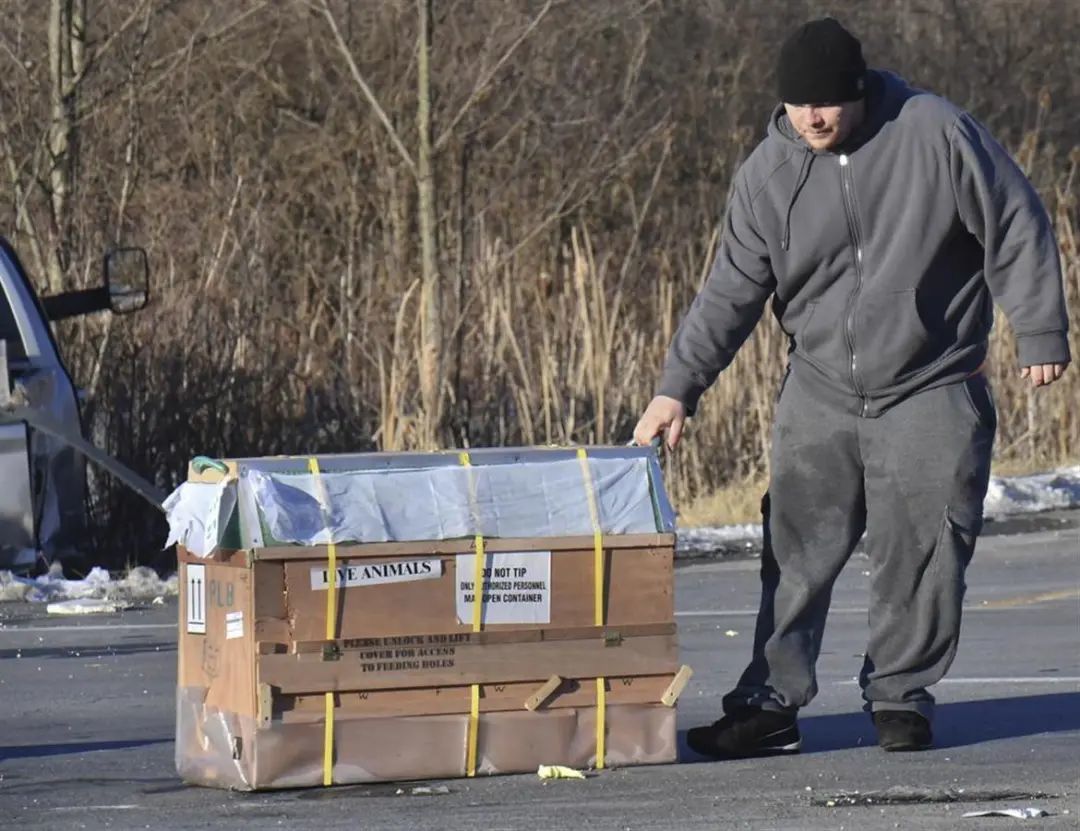 美聯(lián)社發(fā)布的照片顯示,事故現(xiàn)場多個板條箱散落在地,板條箱上寫著“內(nèi)有活物”字樣。警方帶槍展開搜尋。