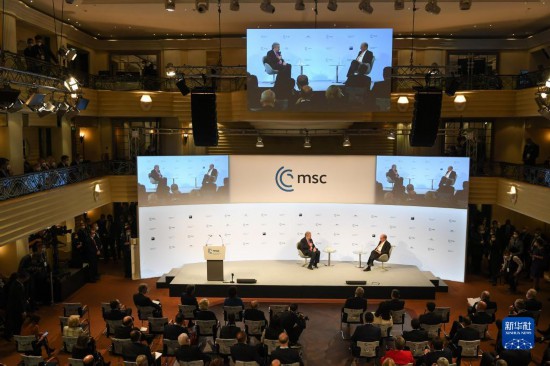 2月18日,在德國慕尼黑,慕安會主席伊申格爾(臺上右側)在會上與聯(lián)合國秘書長古特雷斯對話。新華社記者 逯陽 攝