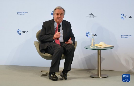 2月18日,在德國慕尼黑,聯(lián)合國秘書長古特雷斯在會上發(fā)言。新華社記者 逯陽 攝