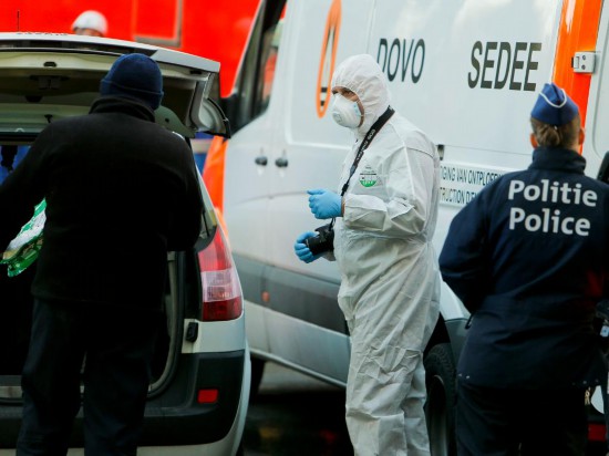 2015年11月26日,醫(yī)護人員在比利時首都布魯塞爾的大清真寺外工作。布魯塞爾大清真寺內(nèi)26日發(fā)現(xiàn)裝有白色粉末的可疑包裹。警方疏散了大清真寺內(nèi)的人員,工作人員攜帶檢測炭疽桿菌的設備到場調(diào)查。(新華社記者周磊攝)