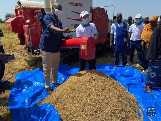 這是2021年10月8日,中國專家組成員在布基納法索中西大區(qū)水稻示范區(qū)指導(dǎo)機(jī)械化水稻收割作業(yè)。新華社發(fā)(中國農(nóng)業(yè)組供圖)