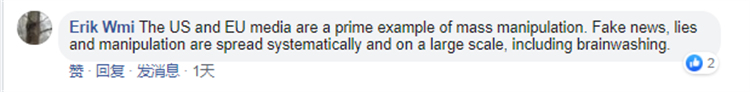 網(wǎng)友Erik Wmi在人民網(wǎng)英文社交媒體賬號(hào)留言稱:“美國(guó)和歐盟的媒體是大規(guī)模操縱的典范。假新聞、謊言被系統(tǒng)地、大規(guī)模地傳播,給人們洗腦!