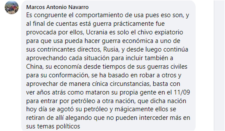 有西語(yǔ)網(wǎng)友表示,這場(chǎng)戰(zhàn)爭(zhēng)實(shí)際上是因美國(guó)而起,烏克蘭只是替罪羊,美國(guó)卻可以借此向俄羅斯挑起經(jīng)濟(jì)戰(zhàn):“美國(guó)當(dāng)然還會(huì)繼續(xù)利用各種事件,屆時(shí)將把中國(guó)也卷進(jìn)來(lái)。美國(guó)的經(jīng)濟(jì)從很久之前內(nèi)戰(zhàn)時(shí)期就是建立在竊取和利用別人的成果之上的,看看9.11事件,美國(guó)為了獲取另一個(gè)國(guó)家的石油,殺了自己的人民,而另一個(gè)國(guó)家今時(shí)今日已經(jīng)石油枯竭;闹嚨氖谴藭r(shí)美國(guó)說(shuō)要撤軍,借口說(shuō)他們不再介入別國(guó)的政治了!
