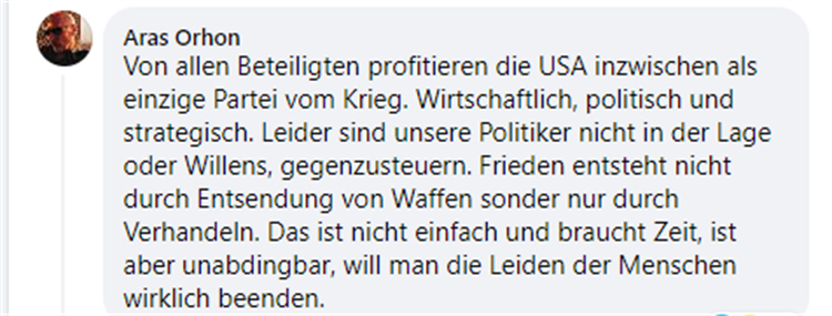 “他們希望戰(zhàn)爭(zhēng)繼續(xù)下去以出售更多的武器!钡聡(guó)網(wǎng)友也表示,美國(guó)是戰(zhàn)爭(zhēng)中唯一一個(gè)從各方獲益的國(guó)家,包括經(jīng)濟(jì)、政治和戰(zhàn)略層面。“可惜我們的政治家們既無(wú)能力也無(wú)意愿加以抵制。”海外網(wǎng)友道破美國(guó)在這場(chǎng)危機(jī)中的利益所在。