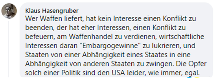 海外網(wǎng)友直言,軍火商并不想終止戰(zhàn)爭(zhēng),只想火上澆油,從而在軍火生意中大賺一筆,從“制裁紅利”中攫取利益并且強(qiáng)迫主權(quán)國(guó)家依附于別的國(guó)家!安恍业氖,美國(guó)對(duì)這種策略的犧牲者毫不在乎!