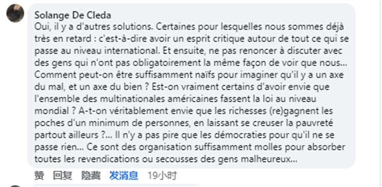 還有網(wǎng)友呼吁大家對(duì)國(guó)際層面發(fā)生的一切事情都要有批判性思維:“大家真的希望讓美國(guó)的多邊組織制定全球范圍內(nèi)的法律嗎?大家真的希望讓財(cái)富(重新)進(jìn)入少數(shù)人的口袋,貧困在其他地方加劇嗎?沒(méi)有什么比未曾遭遇這一切的民主國(guó)家更糟糕了……這些組織像塊‘海綿’吞沒(méi)了所有不幸人民的聲音和所遭遇的沖擊……”