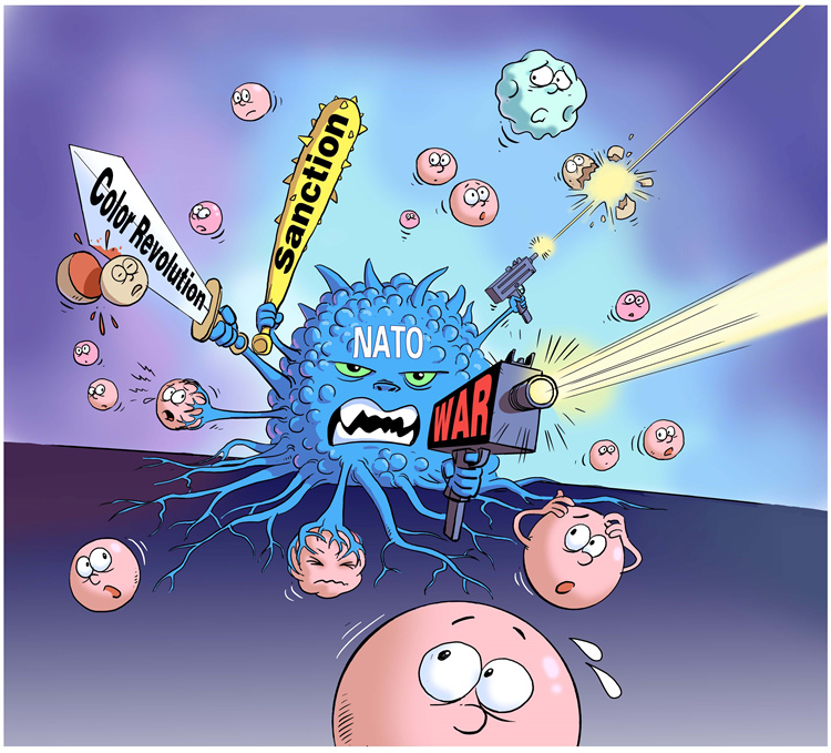 為建立“一超獨霸”的單級世界,以美國為首的北約悍然對南聯(lián)盟進行轟炸,用導彈野蠻襲擊了中國駐南聯(lián)盟大使館,并且不惜對主權(quán)國家發(fā)動一系列戰(zhàn)爭,造成阿富汗、伊拉克、利比亞、敘利亞等國家數(shù)以千萬計的難民流離失所。為謀取地緣政治私利,北約在世界范圍內(nèi)不斷策動“顏色革命”,只待火中取栗,亂中漁利。對俄羅斯、朝鮮、伊朗、委內(nèi)瑞拉等“不聽話”的國家,北約動輒揮舞單邊制裁大棒,濫用長臂管轄,進行政治、經(jīng)濟、科技等全方位制裁。