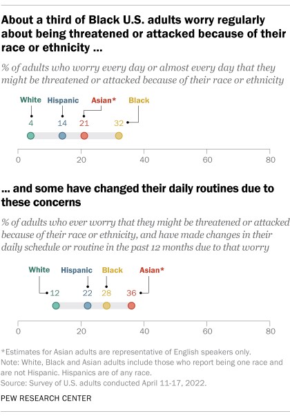 皮尤研究中心2022年4月中旬進行的調(diào)查數(shù)據(jù)顯示,受訪者中約有三分之一的黑人擔憂因種族原因受到暴力襲擊,而白人受訪者中這一比例僅占4%。圖片來源:皮尤研究中心官網(wǎng)