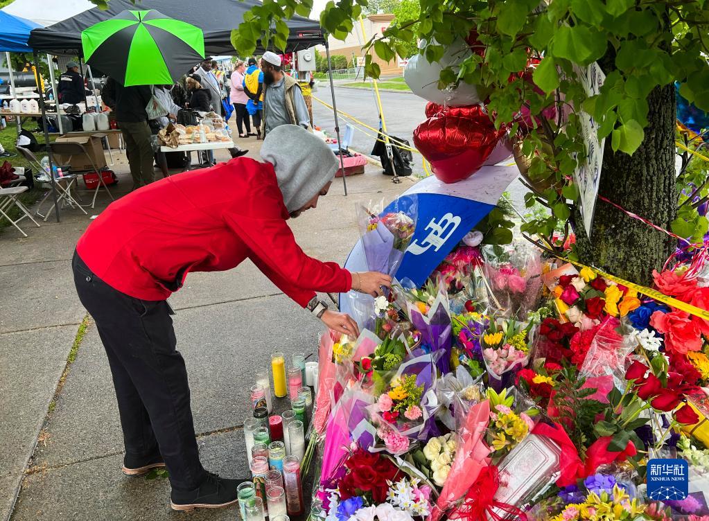 5月16日,在美國紐約州布法羅市,一名男子擺放花束悼念槍擊事件遇難者。美國紐約州布法羅市一家超市14日發(fā)生槍擊事件,造成至少10人死亡、3人受傷。新華社發(fā)(張杰 攝)