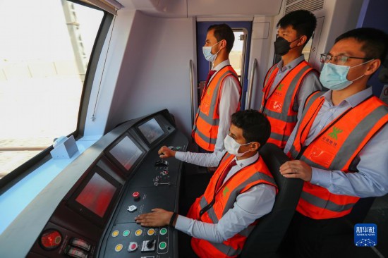 7月3日,在埃及開羅東部,中方工作人員監(jiān)看由中國培訓的埃及輕軌列車駕駛員駕駛一輛試運行的輕軌列車。