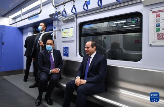 7月3日,埃及總統(tǒng)塞西(右一)和總理馬德布利(右二)在開(kāi)羅出席齋月十日城輕軌鐵路通車(chē)試運(yùn)行活動(dòng)。