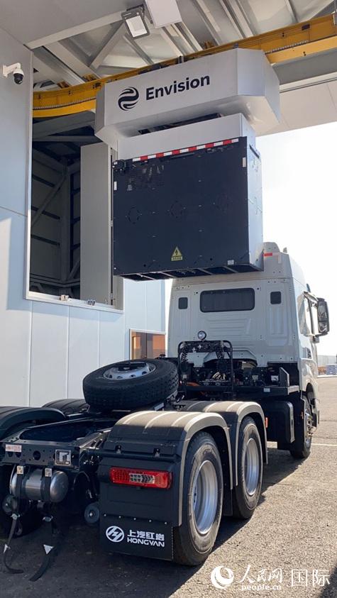 遠(yuǎn)景零碳產(chǎn)業(yè)園內(nèi)的換電重卡項目。人民網(wǎng)記者 吳思萱攝