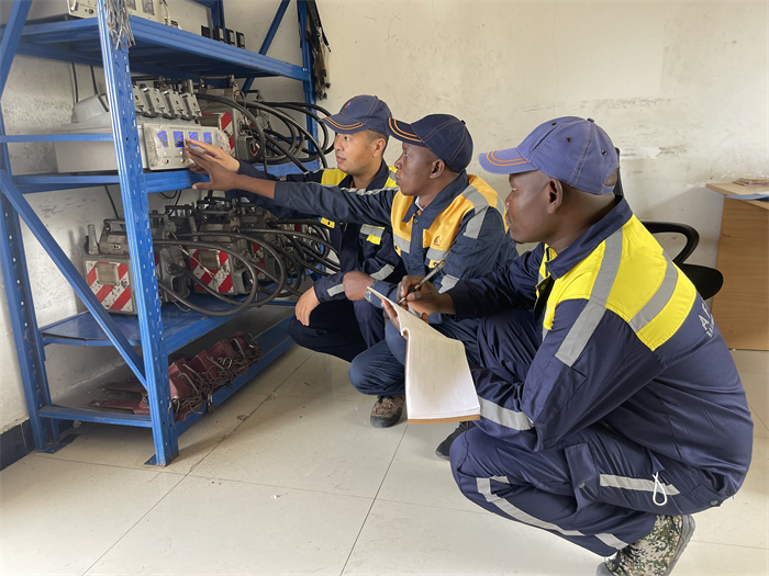 赫斯本·阿金加(中)和同事們檢查列尾裝置充電器工作情況。非洲之星鐵路運營公司供圖