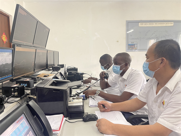 在車站行車室內(nèi),赫斯本·阿金加(中)與工作人員共同確認調(diào)車信號開放狀態(tài)。非洲之星鐵路運營公司供圖