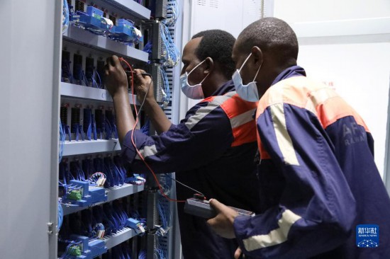 7月27日,信號(hào)工丹尼爾(左)和帕特里克在肯尼亞蒙內(nèi)鐵路蒙巴薩終點(diǎn)站檢查信號(hào)設(shè)備。