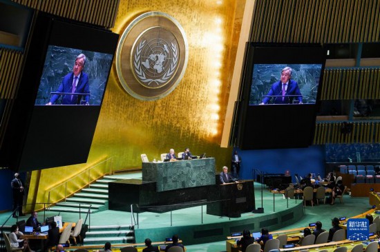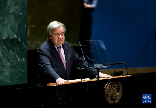 9月13日,在位于紐約的聯(lián)合國(guó)總部,聯(lián)合國(guó)秘書長(zhǎng)古特雷斯在第77屆聯(lián)合國(guó)大會(huì)第一次全會(huì)上致辭。新華社記者 王迎 攝