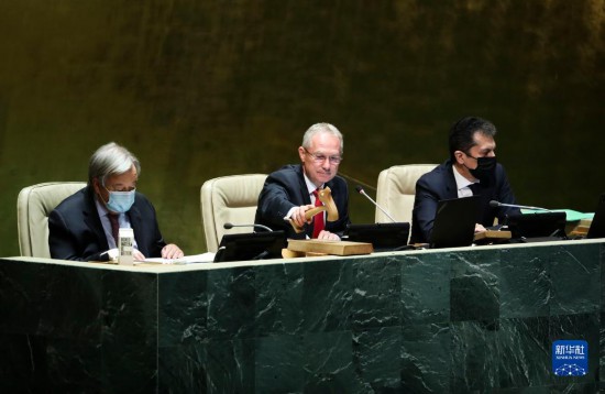 9月13日,在位于紐約的聯(lián)合國(guó)總部,第77屆聯(lián)合國(guó)大會(huì)主席克勒希(中)主持會(huì)議。新華社記者 王迎 攝