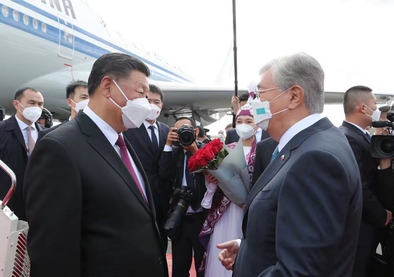 當(dāng)?shù)貢r(shí)間9月14日下午,國(guó)家主席習(xí)近平乘專機(jī)抵達(dá)努爾蘇丹國(guó)際機(jī)場(chǎng),開始對(duì)哈薩克斯坦共和國(guó)進(jìn)行國(guó)事訪問。哈薩克斯坦總統(tǒng)托卡耶夫率政府副總理兼外長(zhǎng)特列烏別爾季、努爾蘇丹市市長(zhǎng)庫(kù)里吉諾夫等高級(jí)官員在機(jī)場(chǎng)熱情迎接。 新華社記者 姚大偉 攝